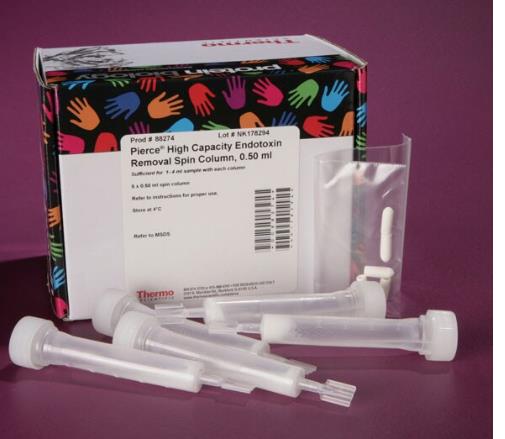 Thermo Scientific Pierce 高容量内毒素去除树脂可在 1 小时内将蛋白样品中的内毒素水平降低 ≥99%;利用这种离心杯形式,蛋白回收率为 ≥85%。 高容量内毒素去除树脂离心柱的特点: •高容量—结合浓度高达 2,000,000 EU/mL†,可消除 >99% 的内毒素 • 选择性—回收 ≥85% 的蛋白样品 • 高性能—可将最终 EU 浓度降低至 <5 EU/mL,符合 FDA 标准 • 快速— 我们全新的离心杯形式可在 1 小时内去除内毒素 • 清洁—单次使用离心柱可避免样品交叉污染 • 优化—离心杯已针对不同的样品量进行了优化 Pierce 高容量内毒素去除树脂结合了多孔纤维素珠和经 FDA 批准的食品防腐剂,即聚(ε-赖氨酸),作为选择性地结合内毒素的亲和配体。修饰的聚赖氨酸亲和配体避免了与使用多粘菌素 B 配体和脱氧胆酸钠缓冲液的替代技术相关的毒性问题。 需要: 无内毒素水 应用: 在细胞转染或动物进样前,消除来自蛋白或抗体样品的内毒素 为研究、疫苗或治疗用途制备的生物衍生产物中存在内毒素是一大问题,因为其对这些分子的生物响应多种多样且可能有害。从细菌培养物中纯化的蛋白中内毒素污染是由革兰氏阴性菌(如大肠杆菌)外细胞膜中衍生的残留脂多糖 (LPS) 引起的。将被内毒素污染的蛋白样品转染进细胞或注入到动物宿主中,可启动强免疫反应,产生全身性炎症反应综合征 (SIRS) 和/或脓毒症。使用多粘菌素 B 和脱氧胆酸钠清除样品中内毒素的传统内毒素去除树脂还具有神经毒性和急性肾小管坏死的负面影响。 Pierce 高容量内毒素去除树脂是一种多孔纤维素珠,其表面被共价连接的聚赖氨酸链修饰,这些链对 LPS 具有高度亲和力,但缺乏其他内毒素结合分子的毒性。利用 2,000,000 EU/mL 的结合容量,在初始内毒素水平为 10,000 EU/mL 的样品中,可将内毒素水平降低 99%。使用高容量内毒素去除树脂处理的典型蛋白样品的最终内毒素浓度低于 5 EU/mL。该离心杯规格是一种快速的单次使用产品,可以在短短 1 小时内从蛋白质样品中去除内毒素。离心杯使用批量规格去结合并去除内毒素,同时实现 >85% 蛋白回收率。 † 一个内毒素单位/mL (EU/mL) 约等于 0.1ng 内毒素/mL 溶液。 |